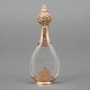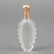 Kristallen parfumflacon met 14kt gouden montuur en dop met gegraveerd bloemdecor, glazen binnenstopje aanwezig, 19e eeuw, 10 cm