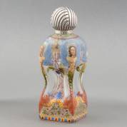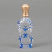 Kristallen parfumflacon, glas met motieven in blauw, 14kt gouden montuur en dop met parelrand, glazen binnenstopje aanwezig, 19e eeuw, 8 cm -deukje achterzijde dop-
