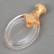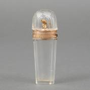 Kristallen parfumflacon met glazen dop en 14kt gouden montuur, kurken binnenstopje aanwezig en bekroond met vogel, 19e eeuw, 9,5 cm -vogel op binnenstopje zonder kopje-