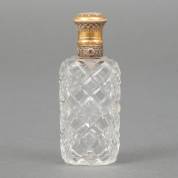 Kristallen parfumflacon met ruitslijpsel en 14kt gouden montuur en dop met opgelegde draadmotieven, glazen binnenstopje aanwezig, 19e eeuw, 9,5 cm