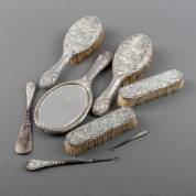 Achtdelige 1e gehalte zilveren kapset met decor van twee dames in landschap en luitspelende heer, bestaande uit: twee haarborstels, handspiegel, twee kledingborstels, schoenlepel, en twee veterhaken, meester: I S Greenberg & Co., Birmingham, 1889-1941, brutogewicht 779 gram, spiegel 27 cm -deuken en defecten-