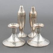 Paar balustervormige 2e gehalte zilveren strooiers, en paar 2e gehalte zilveren lage tafelkandelaartjes, brutogewicht 183 gram, kandelaar 6 cm en strooier circa 10 cm -gebruikssporen, één voetvulling mist-