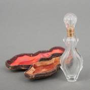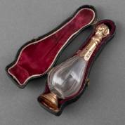Parfumflacon met 14kt gouden montuur en dop, in foedraal, circa 10,5 cm -defect-