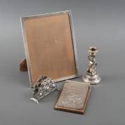 Divers zilverwerk: 1e gehalte zilveren geguillocheerde fotolijst, 2e gehalte zilveren blocnotehouder met genrevoorstelling, 3e gehalte zilveren servethouder, en zilveren kandelaar, de stam gevormd als een meerman, de voet met palmetten en met inscriptie: 'ARC', onduidelijk gekeurd, brutogewicht 798 gram, fotolijst 24,5 × 18,5 cm -fotolijst verbogen, kandelaar met gedeukte voet-