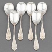 Zes 3e gehalte zilveren lepeltjes met getorste steel, de achterzijde met medaillon, gewicht 100 gram, 14 cm
