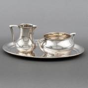 Driedelig 2e gehalte zilveren roomstel, bestaande uit: ovaal dienblaadje, roomkan en suikerschaal, meester: Gerritsen en Van Kempen, Zeist, 1955 en 1956, gewicht 303 gram, dienblad circa 20 × 15 cm -dienblad heeft deuk-
