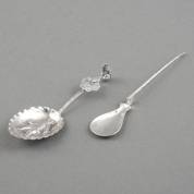 1e gehalte zilveren roomlepel met voorstelling van een zaaier in de bak, gemerkt BM mogelijk voor Berthold Muller, 13 cm, gewicht 25 gram, en 2e gehalte zilveren lepel, de steel eindigend in spitse punt, 15 cm, gewicht 18 gram