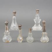 Zes kristallen parfumflacons met veelal 2e gehalte zilveren montuur en dop, één glazen binnenstopje aanwezig, grootste 11 cm -gebruikssporen-