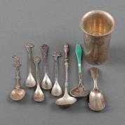 2e gehalte zilveren lepelvaasje met acht diverse zilveren lepeltjes, alle 2e gehalte, gewicht zilver minstens 130 gram