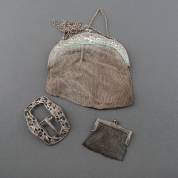 3e gehalte zilveren maliëntas met ketting, daarbij: 2e gehalte zilveren gesp en klein maliënbeursje, gewicht 407 gram, grote tas 17 × 17 cm