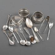 Divers klein zilverwerk, diverse gehaltes, waaronder diverse theelepels en servetbanden, gewicht zilver 224 gram -theeschepje verzilverd-