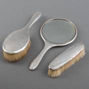 Driedelige 1e gehalte zilveren kapset bestaande uit: spiegel, borstel en kledingborstel, Chester, 1915, brutogewicht 531 gram, borstel 25 cm -gebruikssporen-
