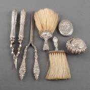 Notenkraker met zilveren heft, handschoenspanner met zilveren heft, twee kwasten met zilveren greep, BWZG dekseldoosje met hangoog en ovaal 2e gehalte zilveren snuifdoosje met oud-Hollands decor, brutogewicht 454 gram, notenkraker 21 cm