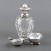 Glazen theebus met 2e gehalte zilveren montuur met parelranden, daarbij: 2e gehalte zilveren theezeef, eveneens met parelrand, op lekbakje, meester: Zilverfabriek Voorschoten, 1951, gewicht zilver circa 100 gram, theebus 16 cm