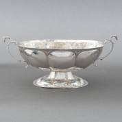 Ovale gelobde zilveren brandewijnkom, Groninger-model, met geciseleerd medaillon, de grepen gevormd als draken, gemerkt met pseudokeuren, circa 1900, gewicht 238 gram, 10,5 × 24 cm