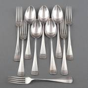 Vijf 2e gehalte zilveren dinercouverts, Haags lof, meester: P. Baardwijk, Schoonhoven, 1935, gewicht 541 gram, lengte 21,5 cm