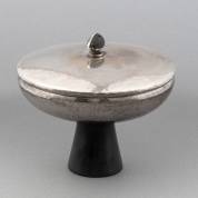 2e gehalte zilveren ciborie met vermeil binnenzijde, de deksel met palissander knop, staand op verzwaarde palissander voet, onduidelijk meesterteken, 1962, brutogewicht 663 gram, Ø 14,5 cm