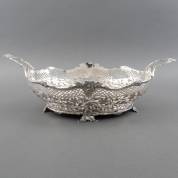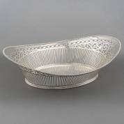 2e gehalte zilveren broodmand, met ajourgezaagde spijlen en motieven, afgezet met parelrand, meester: Zilverfabriek Voorschoten, 1927, gewicht 455 gram, 9 × 33 × 23 cm