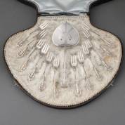 2e gehalte zilveren taartset, bestaande uit twaalf taartvorkjes met getorste steel en een taartschepje met hartvormige schep met fijn gegraveerde motieven, meester: J.M. van Kempen & Zonen, Voorschoten, 1858-1924, gewicht 180 gram, taartschep 18,5 cm, in schelpvormige cassette