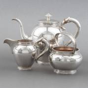 Driedelig 2e gehalte zilveren theeservies met parelrand, meester: D.J. Aubert, 's-Gravenhage, gewicht 888 gram, theepot 17 × 23 × 10 cm