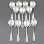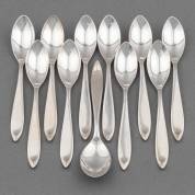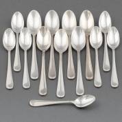 Set van tien 2e gehalte zilveren theelepels en een bijbehorende suikerschep, meester: Gerritsen & Van Kempen, Zeist, circa 1930, gewicht 185 gram, 13 cm