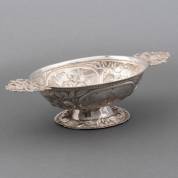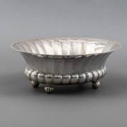 2e gehalte zilveren gelobde schaal met parelrand, staand op vier bolvormige pootjes, meester: Edelstaalbedrijven, gewicht 926 gram, 13 × 35 × 29 cm