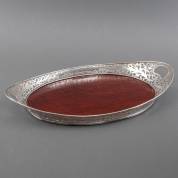 1e gehalte zilveren dienblad, ajourgezaagd met decor van voluten en twee grepen, houten bodem, geen meesterteken gevonden, 1950, brutogewicht 882 gram, 48 ×29 cm