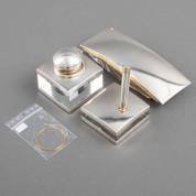 Kristallen en 1e gehalte zilveren bureaustel uit de Solitaire-serie, uitvoering Montblanc, Duitsland, bestaande uit: inktpot, pennenhouder, en blotter, blotter 3,5 × 19 × 7 cm -montuur inktpot zit los-