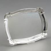 2e gehalte zilveren dienblad met gecontourneerde rand en gegraveerd floraal decor, staande op vier pootjes, meester: Weduwe Elise Henry de Haas, Amsterdam, 1846, winkeliersmerk Verschuur, gewicht 658 gram, 3,5 × 34,5 × 24,5 cm