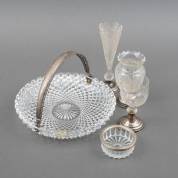 Kristallen hengselmandje met ruitslijpsel en 2e gehalte zilveren hengsel met parelrand, daarbij: twee kristallen vaasjes en één glas met 2e gehalte zilveren voet, en kristallen bakje met 2e gehalte zilveren rand, hengselmand Ø 22 cm