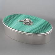 Ovale 1e gehalte zilveren dekseldoos, het deksel gezet met malachiet, waarop een zilveren applique in de vorm van een boeket, vermeil binnenzijde, meesterteken AR tevens gemerkt Alberti, laatste kwart 20e eeuw, brutogewicht 1787 gram, 8 × 24 × 17 cm