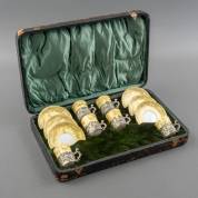 Set van zes porseleinen mokkakopjes en schotels met goudkleurig decor van bloemguirlandes en rasterwerk op geel fond, uitvoering Staffordshire, Engeland, de kopjes gevat in 1e gehalte zilveren opengewerkte houders met decor van putti en bloemen, meester: William Comyns & Sons Ltd., Birmingham, 1902, in cassette met winkeliersmerk Benetfink Silversmiths, Cheapside, E.C.