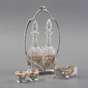 Vierdelig art nouveau tafelstel, met bladdecor, medaillon en vermeil binnenzijde, bestaande uit: olie- en azijnstel, paar ronde zoutschaaltjes en rechthoekig specerijenschaaltje, Duitsland, circa 1900, gewicht zilver 244 gram, olie- en azijnstel 29 × 16,5 × 5,5 cm