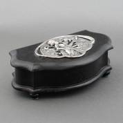 Gezwart houten sieradendoosje met fluwelen binnenwerk en zilveren art nouveau plaquette op de deksel met decor van een dame in natuurlijke omgeving, 5,5 × 16 × 9 cm