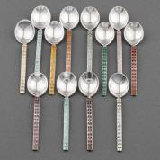 Set van twaalf 1e gehalte zilveren theelepels, elke lepel met een eigen kleur in email gedecoreerd, ontwerp: Gustav Beran, uitvoering: Gerritsen & Van Kempen, Zeist, brutogewicht 98 gram, in houten doos, 8,5 cm