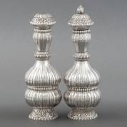 3e gehalte zilveren strooibus en pepermolen, concaafvormig gedecoreerd met palmetten, Italië, 20e eeuw, brutogewicht 693 gram, pepermolen 22 × Ø 7 cm