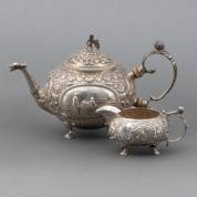 2e gehalte zilveren theepotje en roomkannetje, beide met gedreven decor, gewicht 480 gram, hoogte theepot 12 cm