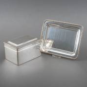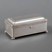 Rechthoekige 2e gehalte zilveren koektrommel op onderschotel met parelrand, meester: D.J. Aubert, 's-Gravenhage, circa 1930, gewicht 736 gram, 9,5 × 20 × 16 cm