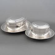 Paar 2e gehalte zilveren koektrommels op onderschotel afgezet met parelrand, meester: C.J. Begeer, Utrecht, 1881, gewicht 1225 gram, ovale trommel 7,5 × 15 × 10,5 cm