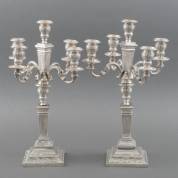 Paar 2e gehalte zilveren vijflichts kandelabers, à double usage, vierkante voet gedecoreerd met guirlandes en parelranden, meester: D.J. Aubert, 's-Gravenhage, brutogewicht 3184 gram, 42 × 22 × 22 cm