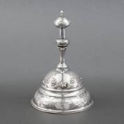 2e gehalte zilveren tafelbel gedreven met guirlandes en strikken, de onderrand met gegraveerde band, meester: Pieter Zöllner & Willem Nicolaas Beijder, Rotterdam, 1863, brutogewicht 274 gram, 16 × Ø 10 cm -steel vastgesoldeerd-