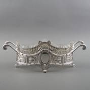 Grote 3e gehalte zilveren jardinière met strikmedaillon, bladdecor en kristallen gefacetteerde binnenbak, meester: Koch & Bergfeld, Bremen, 1890, gewicht zilver 1101 gram, 18,5 × 57 × 22 cm