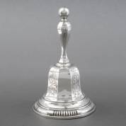 Deels octagonaalgevormde 2e gehalte zilveren tafelbel, vier zijden gegraveerd met voluten, meester: Jacobus Schalkwijk, Rotterdam, 1846, gewicht zilver 102 gram, 16,5 × Ø 9,5 cm