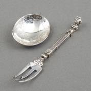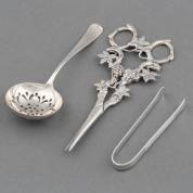 1e gehalte zilveren klontjestang en 2e gehalte zilveren strooilepeltje, Hollands glad, met ajourgezaagde bak, en verzilverde druivenschaar, brutogewicht 114 gram, strooilepeltje 14 cm