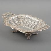 Opengewerkte 2e gehalte zilveren mand op klauwpoten met gedreven palmet- en arendecor, gewicht 545 gram, 9 × 38 × 22 cm