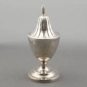 2e gehalte zilveren balustervormige strooier, meester: Johannes Binneveld, Rotterdam, 1817 -pootjes ontbreken-, hoogte 13 cm, gewicht 99 gram