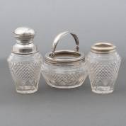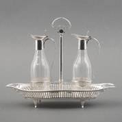1e gehalte zilveren olie- en azijnstel, het zilveren basement met ajourgezaagde spijlen en motieven, de kristallen karafjes met zilveren klepdekseltjes en fijne greep, Chester, 1901, gewicht houder 309 gram, 24 × 29 × 13 cm