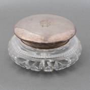 Kristallen wattendoos met 1e gehalte zilveren deksel voorzien van monogram EK, gewicht deksel 69,3 gram, Ø doos 13,5 cm