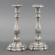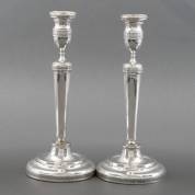 Paar 2e gehalte zilveren kandelaars op ronde voet afgezet met koordrand en palmetbanden, meesterteken L in ruitvorm, de vetvanger met V in ruitvorm, Zuidelijke Nederlanden, 1814-1831, brutogewicht 1357 gram, 29,5 Ø 12 cm