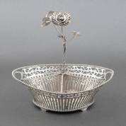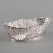 Ovaal zilveren bruidsmandje, ajourgezaagd met spijlen en afgezet met parelrand, met uitneembare vlakverdeler met centraal een bloemstukje, meester: Pieter Staats van Mecklenburg, Amsterdam, vermoedelijk 1795, gewicht 180 gram, 16,5 × 16 × 11 cm